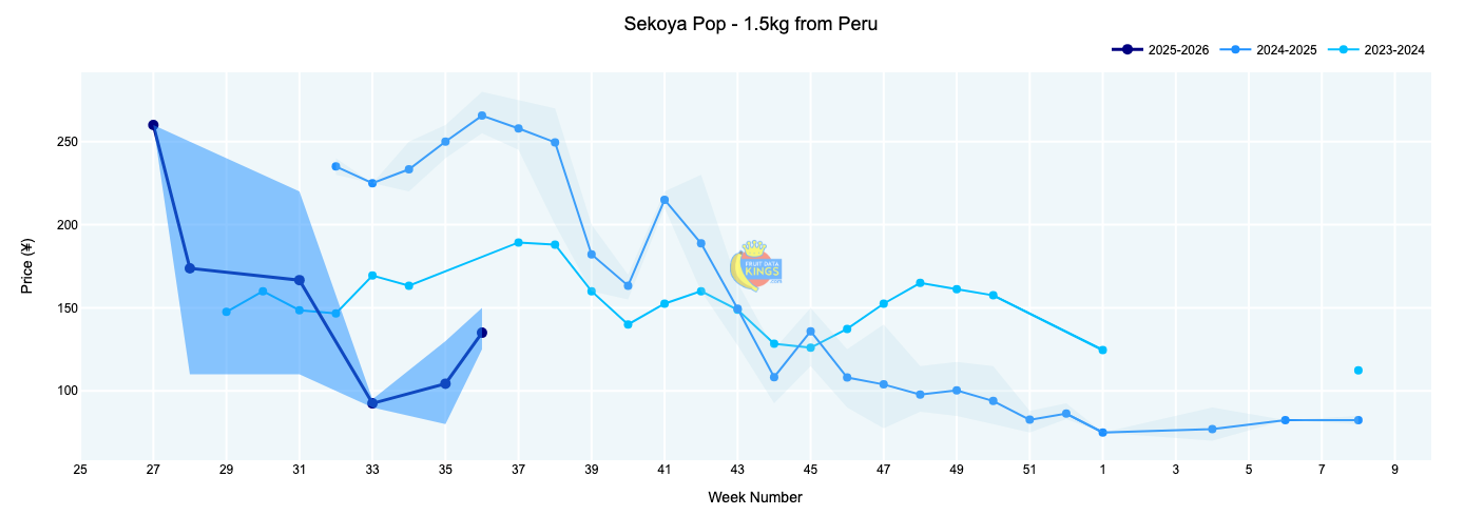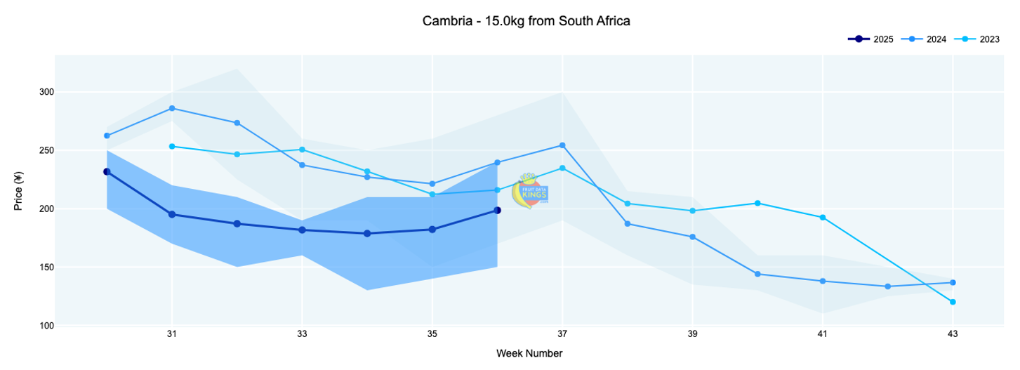 本周橙子市场行情上涨,尤其是南非脐橙,例如Cambria和Witkrans。尽管价格强劲上涨,但大多数时间仍然低于前两季。从第30周到第35周,上述两种脐橙的价格比2024年低20-30%。
