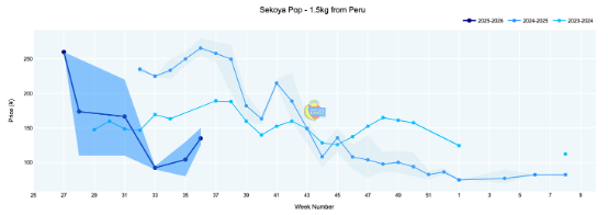 水果价格资讯平台Fruit Data Kings的记录显示,8月末9月初,由于市场货量短缺,秘鲁蓝莓价格快速上涨,供应的品种包括Sekoya Pop、Biloxi、Venture、April Blue等。但是由于中国消费者已经习惯了国产蓝莓偏甜的口感,而早季秘鲁蓝莓口感偏酸,所有秘鲁蓝莓品种的价格仍低于前两季。Sekoya Pop的交易价格比去年同期下降了约49%,Biloxi也下降了40%。部分零售商的平均价格只有15.00元(125克),低于去年的17.25元(125克)。