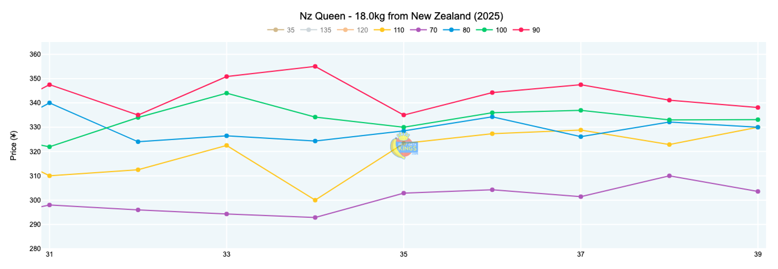 过去三周,新西兰苹果继续占据进口市场主导地位,占到市场供应量的78%。其中新西兰皇后NZ Queen苹果价格坚挺,均价310元(18公斤),丹烁Dazzle价格则达到了406元(18公斤),比2023年上涨约17%,但仍明显低于2024产季。