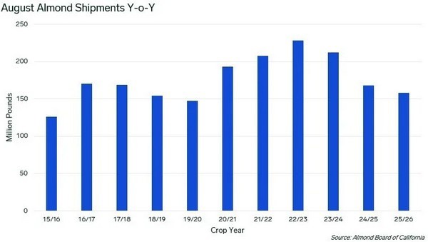 据全球最大的国际证监会组织(IOSCO)认证农业食品价格报告机构Mintec/Expana报道,加州巴旦木协会(Almond Board of California)9月11日发布了8月贸易形势报告,首次披露2025/26产季数据,更新了市场供需状况。报告显示,2025年8月美国巴旦木发货总量为1.58亿磅,较2024年同期下降6%,是自2019年以来进度最慢的产季开局。