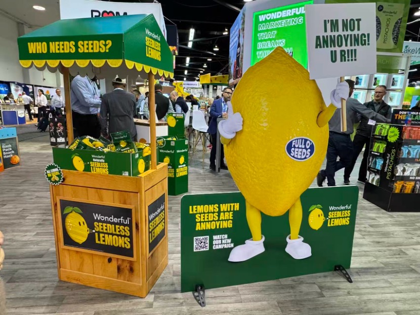 虽然全球果蔬与花卉展主要针对北美市场,但是对中国观展商来说,这也是一次深入学习美国品牌市场营销能力的绝佳机会。以the Wonderful公司的无籽柠檬为例,仅用一个柠檬吐出种籽的卡通形象和一句广告语就精准传达出“有籽”痛点和“无籽”卖点。以消费品思维打造水果品牌,才能提高水果品牌的溢价和长期竞争力。