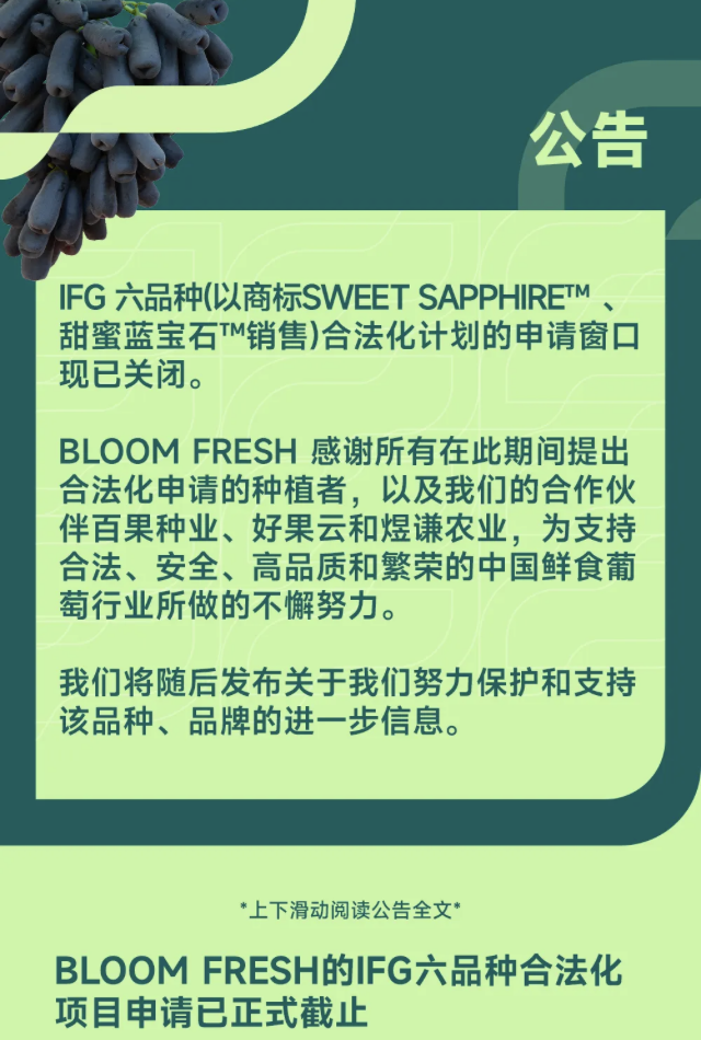未来几个月,BLOOM FRESH 将发布更多关于保护与支持 IFG 六品种和 “SWEET SAPPHIRE™” 、“甜蜜蓝宝石™”品牌的最新进展。