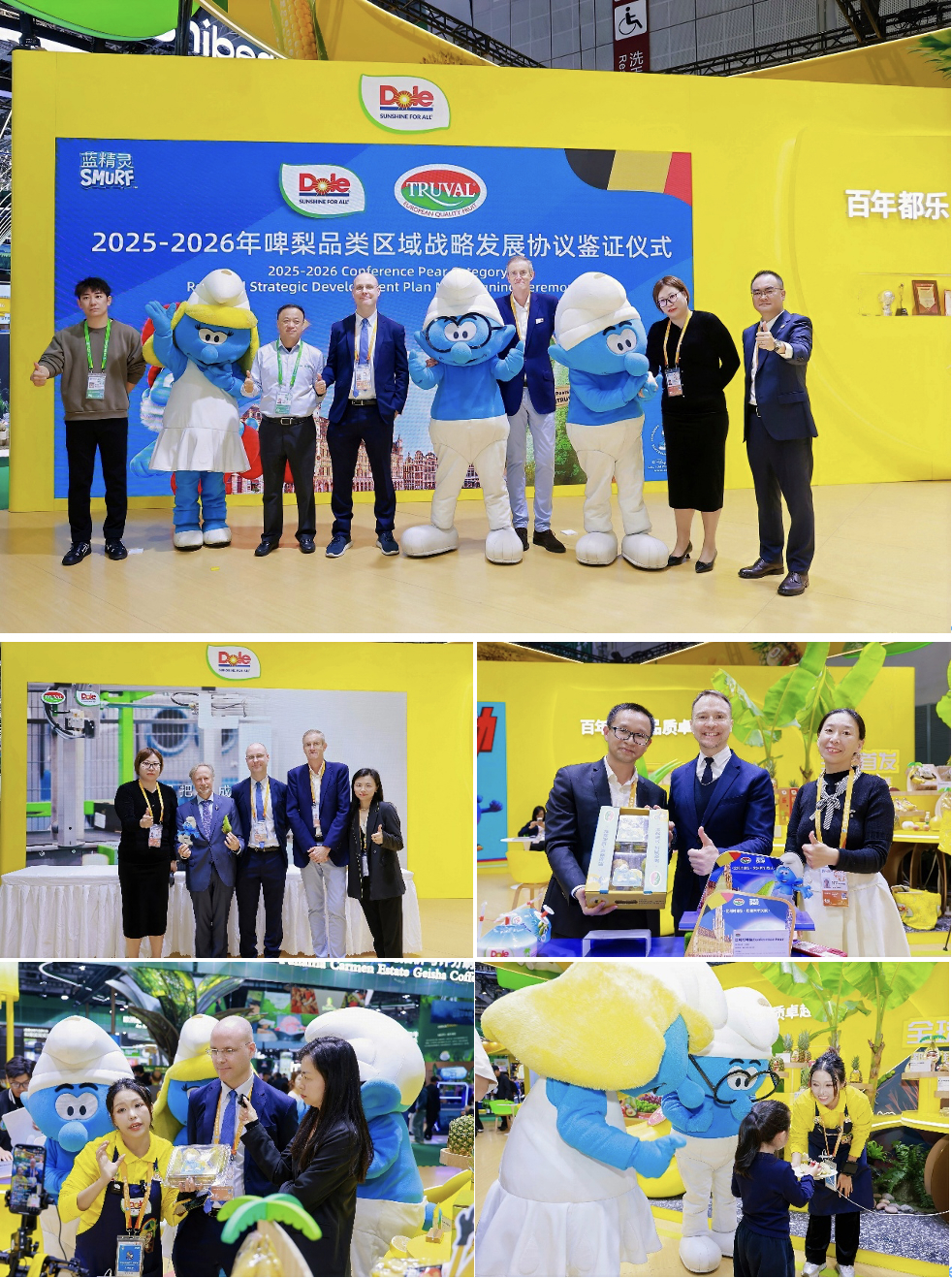 焦点之一是与比利时水果山谷协会及国内头部渠道商百果园、比优特共同举办的2025-2026年啤梨品类区域战略发展协议签订仪式。比利时啤梨即将迎来进入中国市场的第十五年。脆软两吃、细核肉厚,可食率极高,果皮上有着自然的小雀斑,更是天然生长的有力证明。自2011年由都乐率先引进中国以来,都乐与比利时水果山谷协会携手,推动它从“小众精品”走向大众视野。啤梨作为风靡欧洲的明星水果,在比利时的自然培育种植有着超过100年的经验积累,曾在2019年入选比利时公主率领的访华经贸团伴手礼。2024年,都乐与比利时水果山谷协会曾在进博会上联合发布国内首款蓝精灵IP联名款Truval啤梨礼盒,当比利时国宝梨遇上比利时国宝IP,提升产品活力,增强情感联结。随着今年MOU的签署,各方将继续协同投入资源,借助IP影响力深化市场培育,共同打造爆款活动,实现品牌声量与销售业绩的双重提升。