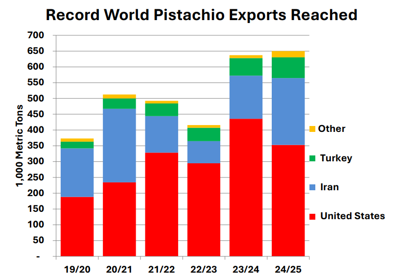 2024/25产季全球开心果产量(以壳果重量计)增长了10%至创纪录的120万吨,因土耳其、伊朗和叙利亚的收成进入丰产年,完全抵消了美国时值小年出现的减产。