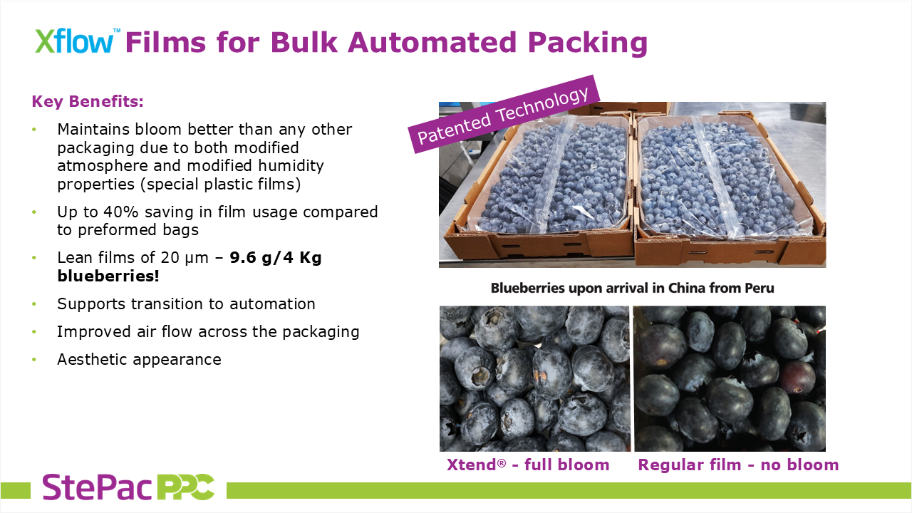 除了理论阐述,研讨会同样聚焦实际应用,两位专家展示了调气包装技术在多种关键果蔬上的突破性成果。蓝莓方面,该技术与StePacPPC的思福乐(Xflow)等自动化包装方案相结合,在保持天然果粉和整体品质的同时,将保鲜期延长至45天以上,并减少约40%的塑料薄膜用量;西兰花方面,思泰德(Xtend)调气与湿度控制解决方案取代了传统装加冰泡沫箱,每次装运可释放多达66%的装箱空间;樱桃方面,基于调气包装的解决方案将货架期延长至4–6周,使智利至中国25天的海运具备商业可行性,同时保持果梗新鲜度和果实硬度;葡萄方面,思泰德解决方案也显著延长了阳光玫瑰等高端品种的销售季,最长可达五个月,持续保持商品的优良品质。