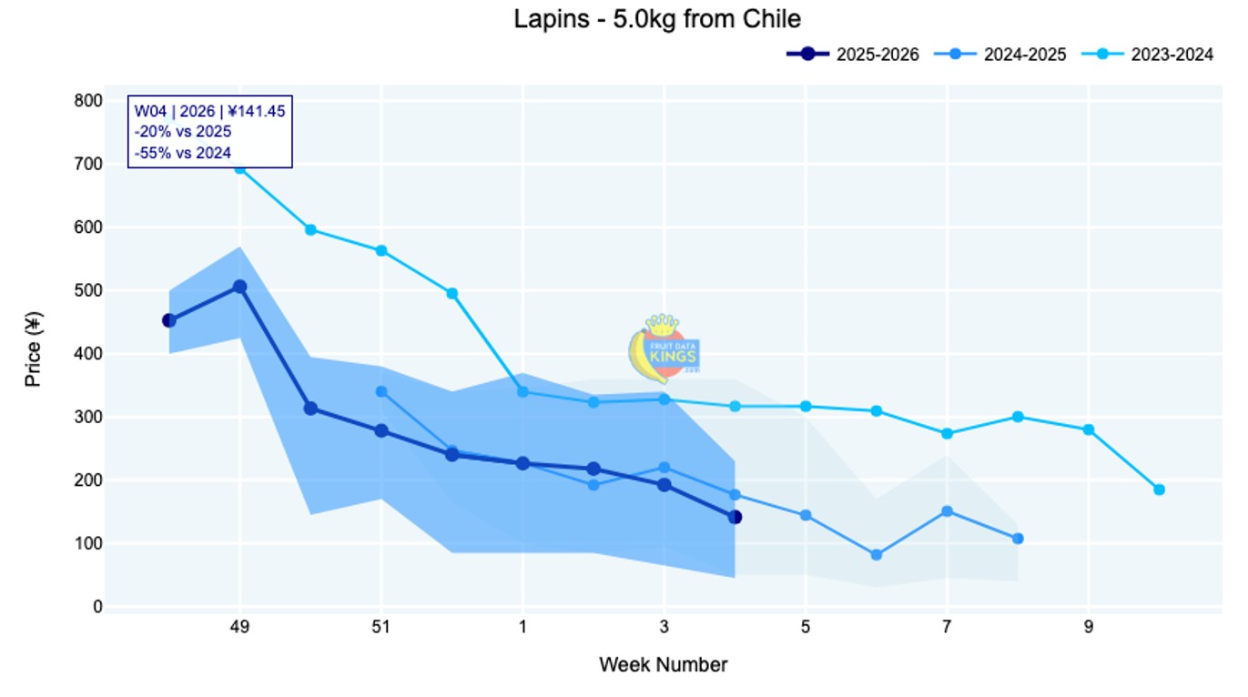 本周市场价格出现明显下降,5公斤装拉宾斯的平均价格降至140元,比2024年同期下降55%,比2025年同期下降20%(2025年本身就是一个充满挑战的年份)。2.5公斤装拉宾斯的情况也与之类似。