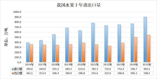 据中国食品土畜进出口商会水果分会消息,2025年我国水果进出口贸易总额达252亿美元,全年进口、出口呈现双增长。